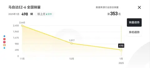 在去年11月份,EZ-6还交出了一份2445辆新车的销量成绩单,可来到12月份,却变成了1017辆。而在今年1月,马自达EZ-6的销量更是断崖式地下跌到了498辆,所以看到这样的销量数据表现情况,我此刻也真想说一句:如今的EZ-6车系,危矣。