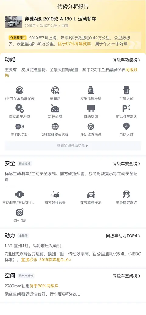 总的来说,购买二手车是一项重要的决策,需要仔细的考虑和评估。这辆白色奔驰A级 2019款 A 180 L 运动轿车在车况、价格、配置、性能、安全、操控、舒适性和空间等方面都表现不错,是一辆值得考虑的二手车。但是,由于我们暂时没有拿到这款车的检测报告,所以无法对车况进行更详细的解读。不过,我们已经针对这款车进行了详尽的大数据分析,希望可以为您提供全面的参考信息。