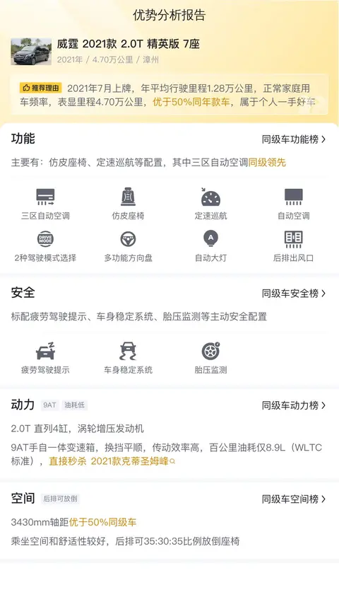 综上所述的新车含税价、用车成本、市场行情、优势分析、同款比价等数据仅供参考。在配置部分,因为二手车非标品,车辆可能会存在配置改装的情况,具体车况信息需要线下结合车辆实际情况进行综合参考。