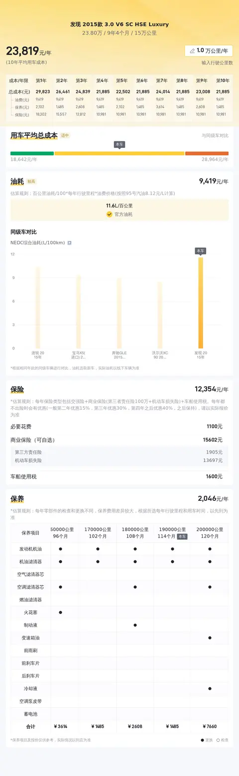 这款车的10年平均用车成本为23678元/年,相较于同级别车型,其用车成本处于较高水平,这主要是由于其较高的油耗所致。