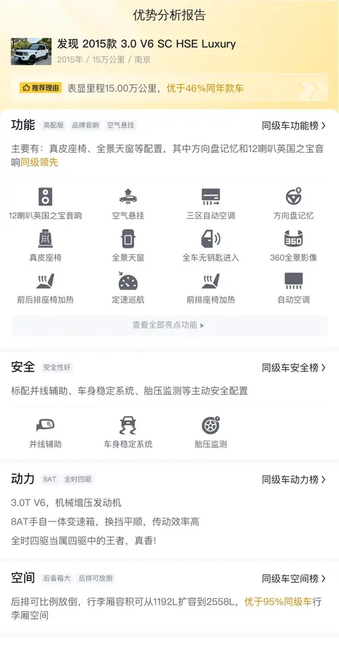 综上所述,路虎发现2015款3.0 V6 SC HSE Luxury以其出色的动力性能、豪华的内部配置和宽敞的内部空间,为驾驶者和乘客提供了极致的驾乘体验。然而,其较高的用车成本和油耗可能是潜在车主需要考虑的因素。尽管如此,这款车仍然因其卓越的性能和豪华的配置而备受推崇。