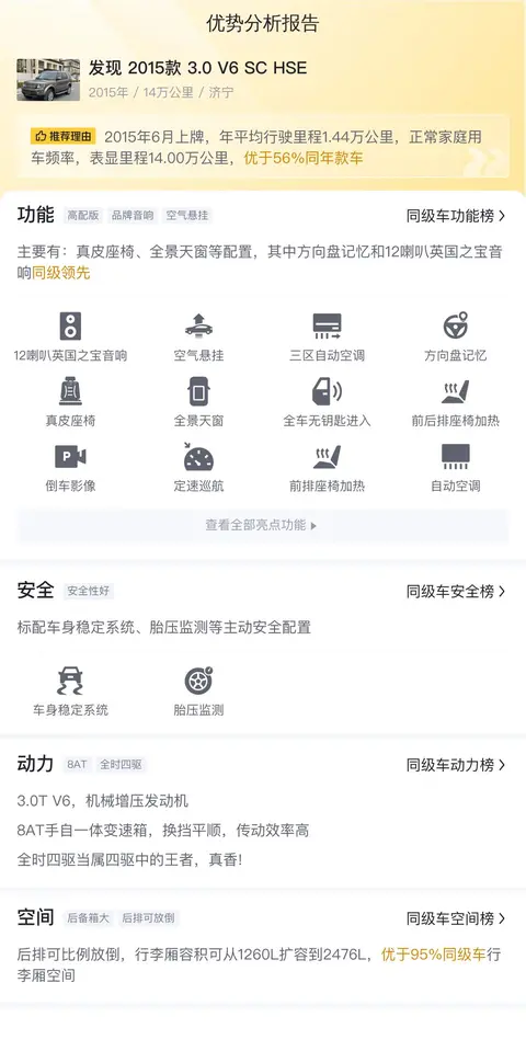 在二手车市场中,每一辆车都有其独特的故事和价值。对于想要购买二手车的朋友来说,选择一辆合适的车型需要考虑多个方面。今天咱们看的这辆发现2015款3.0 V6 SC HSE,总体来说车况良好,性价比也不错。车身颜色为香槟色,经过两次过户,上牌时间为2015年6月,行驶里程为14万公里。外观状态良好,内饰整洁如新,功能使用良好。工况良好,操作正常。内饰方面,真皮座椅、全景天窗、英国之宝音响系统、独立空调控制系统和车载冰箱等配置一应俱全,为乘客提供极致的舒适体验。动力方面,3.0T V6机械增压发动机搭配8速手自一体变速箱和全时四驱系统,确保出色的动力输出和稳定的行驶性能。总体来说,这款车是一款集豪华、舒适、动力和安全于一身的车型,适合那些追求高品质生活和卓越驾驶体验的消费者。