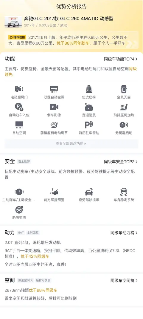 今天我们要介绍的这款奔驰GLC 2017款 GLC 260 4MATIC 动感型上牌日期2017年6月,上牌地、车源地均在武汉,过户次数为0次。表显里程6.6万公里,车身颜色为白色,新车指导价42.90万,二手车报价16.58万。