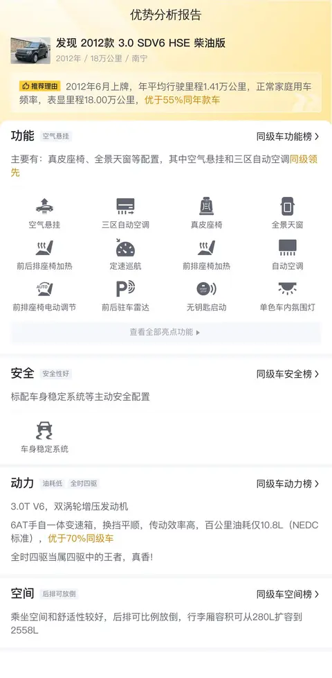 这辆2012款路虎发现3.0 SDV6 HSE柴油版黑金刚上牌地为广西南宁市,上牌日期2012年6月,表显里程18万公里,新车指导价84.8万,二手车报价15.49万,过户次数3次。