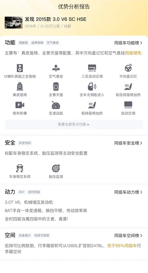 今天给大家带来的车型是发现 2015款 3.0 V6 SC HSE,这台车的新车指导价为92.80万,2016年8月在成都首次上牌,白色车身,表显里程21.30万公里,有1次过户记录。目前二手车报价21.36万。