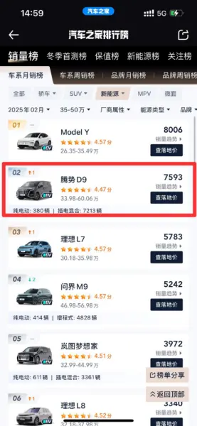 2025 年 2 月 35-50 万级榜单:腾势 D9 销量稳居第二 #腾势D9