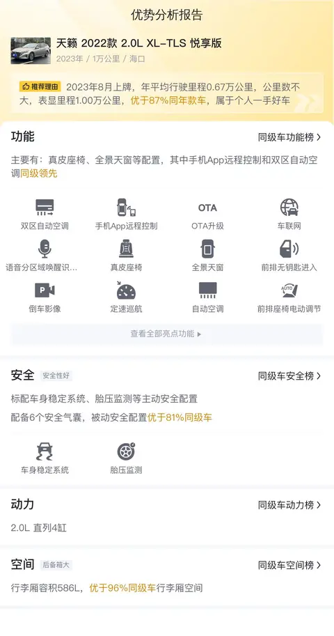 综上所述的新车含税价、用车成本、市场行情、优势分析、同款比价等数据仅供参考。在配置部分,因为二手车非标品,车辆可能会存在配置改装的情况,具体车况信息需要线下结合车辆实际情况进行综合参考。