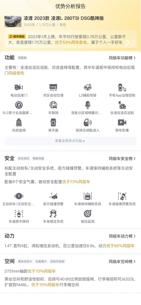 综上所述的新车含税价、用车成本、市场行情、优势分析、同款比价等数据仅供参考。在配置部分,因为二手车非标品,车辆可能会存在配置改装的情况,具体车况信息需要线下结合车辆实际情况进行综合参考。