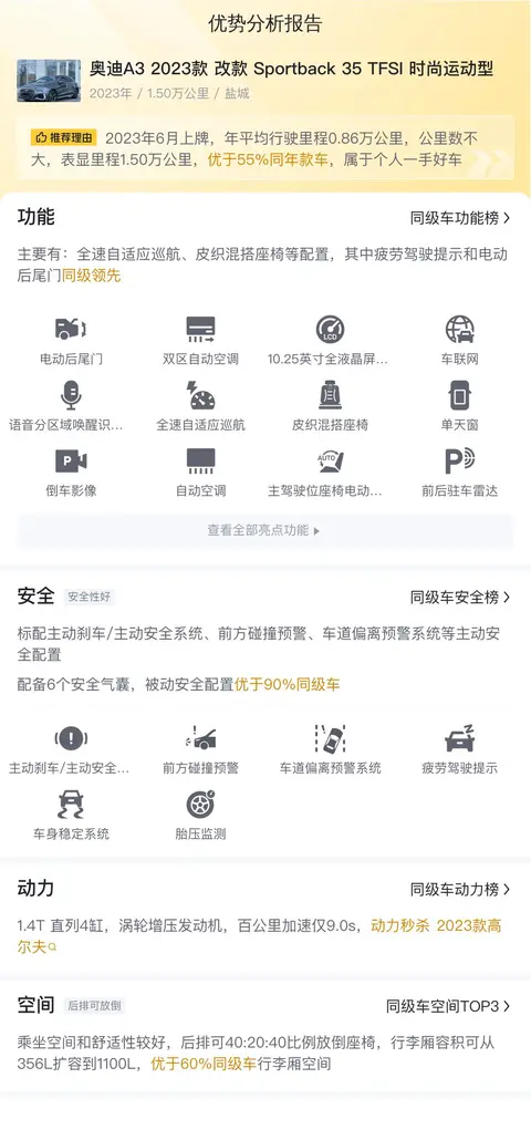 这辆奥迪A3配备了全速自适应巡航、皮织混搭座椅等配置,其中疲劳驾驶提示和电动后尾门同级领先。在安全方面,这辆车标配主动刹车/主动安全系统、前方碰撞预警、车身稳定系统等主动安全配置,配备6个安全气囊,被动安全配置优于90%同级车。动力方面,它搭载了1.4T 直列4缸,涡轮增压发动机,百公里加速仅9.0s,动力秒杀2023款高尔夫。悬架系统采用前麦弗逊式,后多连杆式独立悬挂,提供了良好的操控性和舒适性。