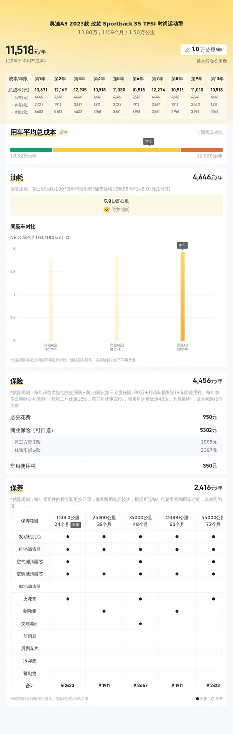 根据大数据分析,目前这款奥迪A3的市场行情较为稳定,且具有一定的保值能力。作为消费者,在购买时可以适当考虑这方面因素。当然,具体的售价还需结合车况、里程数、过户次数等因素综合考虑。关于用车成本方面,这辆车的燃油经济性较高,百公里油耗约为5.8L,年均保养费约为1300元,年均保险费约为4700元。总体来说,这辆车的用车成本相对合理,是一款性价比较高的车型。