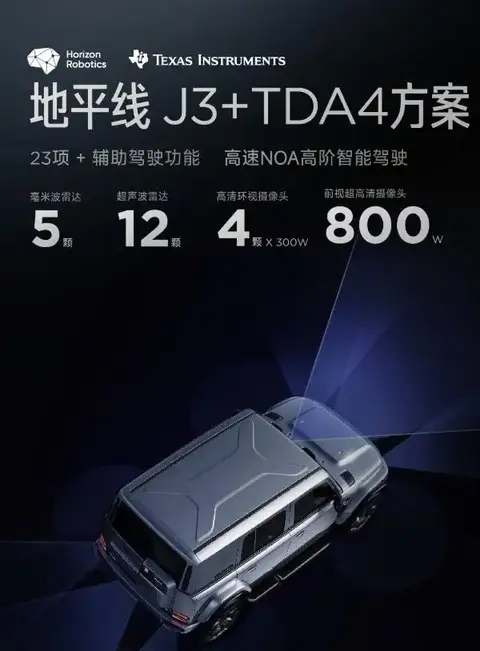 智驾系统,已成为当今消费者购车一大必看产品点,iCAR V23智驾版所搭载的猎鹰500智驾系统,是采用行业少见的“双芯”方案:地平线J3+TDA4,主打一个成熟稳妥。在智驾硬件的选择上,iCAR V23智驾版使用了包含800万前视摄像头、4颗环视摄像头、5颗毫米波雷达、12颗超声波雷达在内的22颗传感器,支持高速NOA领航辅助驾驶在内的23项智能辅助驾驶功能。