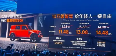 3月18日,iCAR V23智驾版官宣上市,共提供三款配置车型,指导售价区间为11.98万-14.98万元。并给了三重限时购车权益,即5月31日(含)前下单,可享受5000元限时现金立减,以及免费安装原厂充电桩、为期两年的10G/月免费娱乐流量和终身免费APP车辆远程控制。更重要的是,iCAR V23智驾版还提供终身整车质保、终身三电质保、终身免费救援。