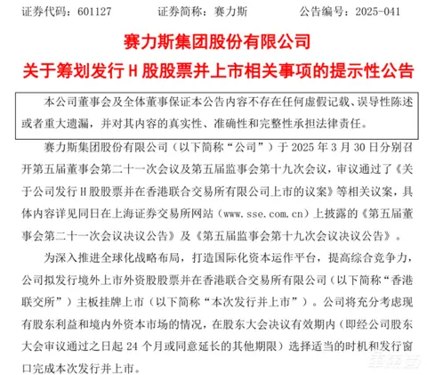 同时就在今天,赛力斯公告称,其于2025年3月30日召开了董事会和监事会,审议通过发行H股股票并在香港联合交易所有限公司上市的议案。