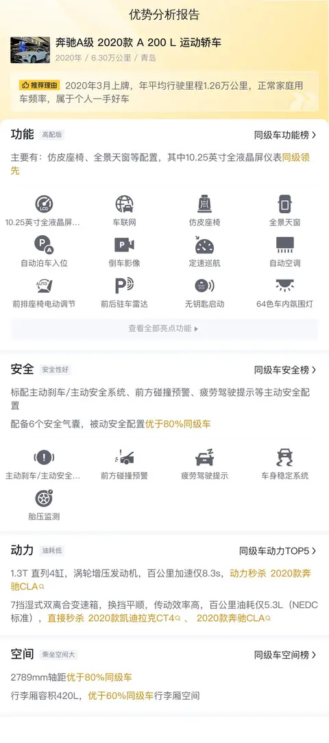 首先来大致了解一下这辆车的基本信息,该车的具体版本是——奔驰A级 2020款 A 200 L 运动轿车,上牌地为青岛,上牌日期2020年3月,表显里程6.3万公里,白色车身,新车指导价26.48万,二手车报价12.35万,未过户。