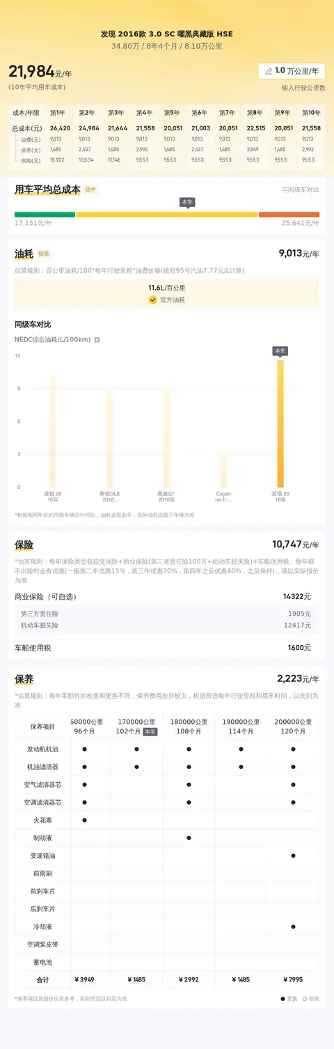 接下来,我们来聊一聊大家比较关心的价格方面。关于二手车定价,有几点车况信息通常具有决定性的影响,那就是车辆的里程、车龄以及过户次数。针对这台二手路虎发现,我们进行了详细的市场行情分析: