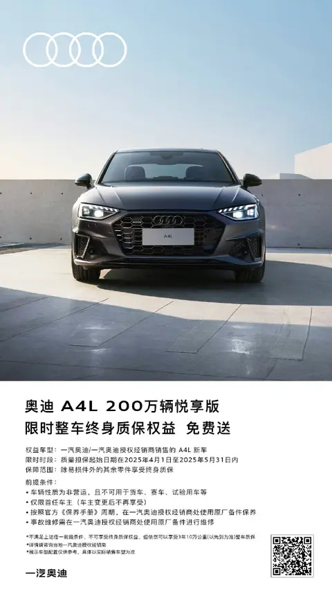 福利来啦!奥迪A4L(图片|配置|询价) 200万辆悦享版推出限时免费终身质保政策,面对一众竞品,奥迪以全生命周期价值标准的诚意突围,用品质承诺重塑豪华中高端轿车消费决策链。