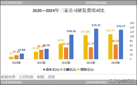 据财报显示,近5年,在“蔚小理”这三家公司中,蔚来的研发费用是最高的,为443.84亿元;小鹏研发费用最低,近五年为227.89亿元。