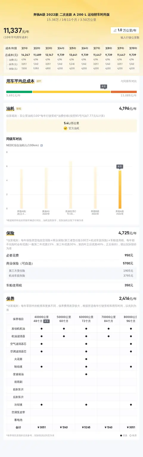 据估算,同级车的最低用车成本是6506元/年,最高是13181元/年,奔驰A级 2022款 二次改款 A 200 L 运动轿车时尚版是11338元/年,用车成本不算低。