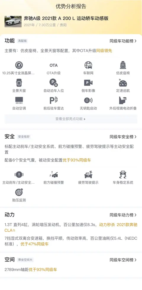 这辆奔驰A级 2021款 A 200 L 运动轿车动感版配有全液晶仪表、全景天窗等配置,其中智能互联和 OTA 升级更是同级领先。动力方面,搭载 1.3T 四缸发动机,匹配七速湿式双离合变速器,百公里加速时间为 8.3 秒,综合油耗为 5.4L/100km(NEDC 标准)。