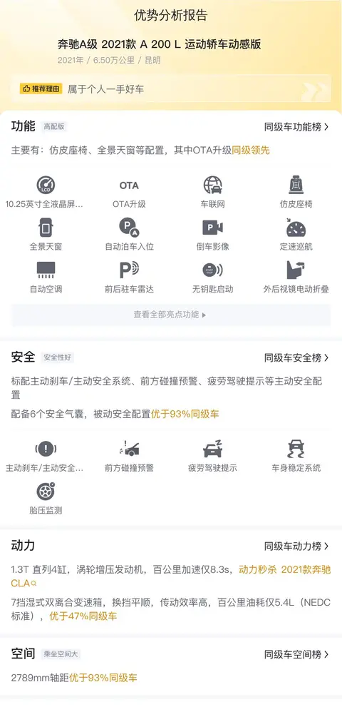 先来看看这辆二手奔驰A级 2021款 A 200 L 运动轿车动感版的基础信息: