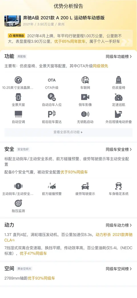 先来看看这辆二手奔驰A级 2021款 A 200 L 运动轿车动感版的基础信息: