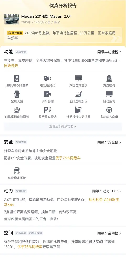 这辆二手保时捷Macan的具体版本是——2014款 Macan 2.0T,车源地为南宁,上牌地为南宁,上牌日期2015年5月,表显里程12.1万公里,车身颜色咖啡色,新车指导价55.8万,二手车报价12.6万,过户次数2次。