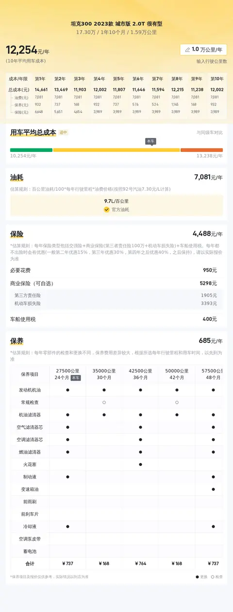 接下来,我们来探讨一下大家购车时都非常关注的经济方面的情况。在保险方面,专业机构对这款车的年均商业保险费用大约为5188元,这是基于以往数据对保险费用的预估,实际费用会根据投保的具体情况和车主的驾驶记录有所变动。在保养方面,根据过往车主的数据总结,这款车型的年均保养费用大约为3246元。需要指出的是,这一费用会随着车辆使用年限和里程数的增加而产生一些变化。接着是油耗部分,这款车的官方油耗为9.7L/100km。这里要说的是,油耗跟车主的驾驶习惯有着直接关系,所以实际用车过程中每个人的油耗体验可能会不一样。
