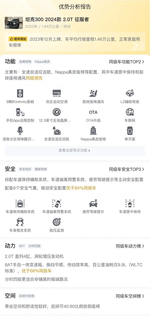 优势方面,整车外观保持良好,准新车,配置丰富,尤其车道居中保持和前排座椅通风等配置,不仅提高了驾车便利性,也提升了乘坐舒适度。作为一款越野车,强大的动力系统和良好的通过性,可以满足你长途自驾游的需求。