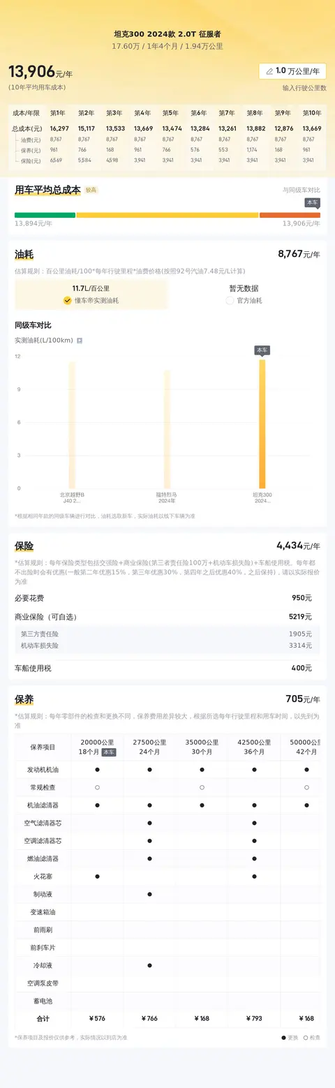 这辆车的10年平均用车成本大概是14180元/年,这个用车成本不算低,这个跟他的定位和整备质量有直接关系。