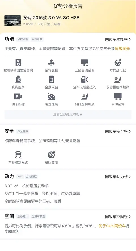 1989年,路虎发现(图片|配置|询价)系列作为路虎卫士的补充车型正式推出,与追求极致豪华的揽胜系列和坚守硬核风格的卫士系列不同,发现系列致力于成为一款“宜家宜野”的车型。2008年,路虎发现系列正式登陆国内市场,并在同年更名为“发现”。今天我们就为您带来一辆二手路虎发现,看看这辆车是否可以让您满意。接下来,让我们共同探索这款车的魅力所在。基础车况这辆发现 2016款 3.0 V6 SC HSE是一辆白色外观的四驱越野车,上牌日期2015年11月,表显里程19万公里,有1次过户记录,车源所在地和上牌地均为成都。新车指导价92.8万,二手车报价27万。
