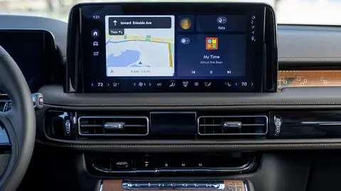 仪表盘右侧是一块13.2英寸的独立式大型触摸屏,配备了与谷歌联合开发的全新林肯数字体验系统(Lincon Digital Experience)。该系统包括10扬声器的林肯高级音响系统、Apple CarPlay、Android Auto、SiriusXM卫星广播、5G LTE Wi-Fi热点以及林肯互联(Lincoln Connect)应用程序和服务。该系统还支持个性化设置,涵盖空调、驾驶辅助功能、音响、后视镜和座椅的个性化设置。车主可以访问亚马逊Alexa和谷歌地图,甚至可以在停车时浏览网页或观看流媒体电影。