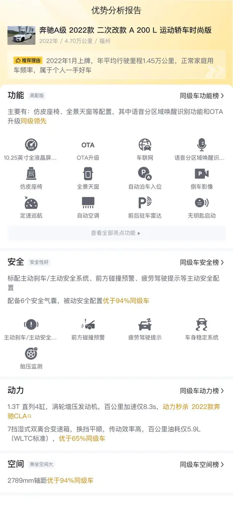 奔驰A级(图片|配置|询价)定位是紧凑型豪华轿车,竞品车型有宝马1系、奥迪A3等,这款2022款二次改款 A 200 L 运动轿车时尚版的新车含税价为27.82万,如今不到3年,只要12.98万就可以开回家一辆奔驰,还是挺划算的。
