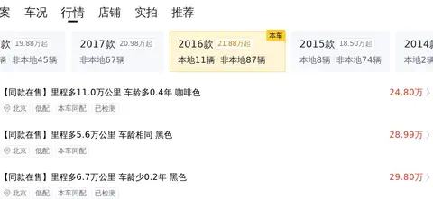 发现 2016款 3.0 SC 曜黑典藏版 SE 的市场行情价是32.98万-38.67万,它的报价则是32.5万,报价低于市场行情,同时保值率也高,因为它的过户次数较多,所以价格较低。