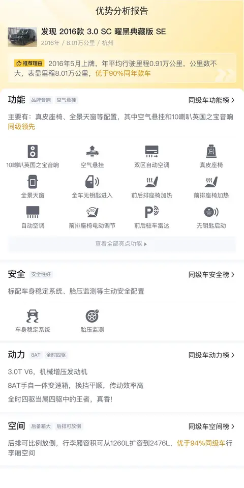 综上所述的用车成本、市场行情、优势分析、同款比价等数据仅供参考,车况信息需要线下结合车辆实际情况进行综合参考。这款发现 2016款 3.0 SC 曜黑典藏版 SE,报价低于市场行情,保值率高,外观保持较好,内饰有几处瑕疵,不影响使用,整体车况还可以,同时10年平均用车成本是22443元/年,也属于正常支出。如果您在物色一款日常家用SUV,同时预算又较为吃紧,那么不妨考虑一下这款发现吧!毕竟开九年多加三十多万的差价,性价比还是不错的!
