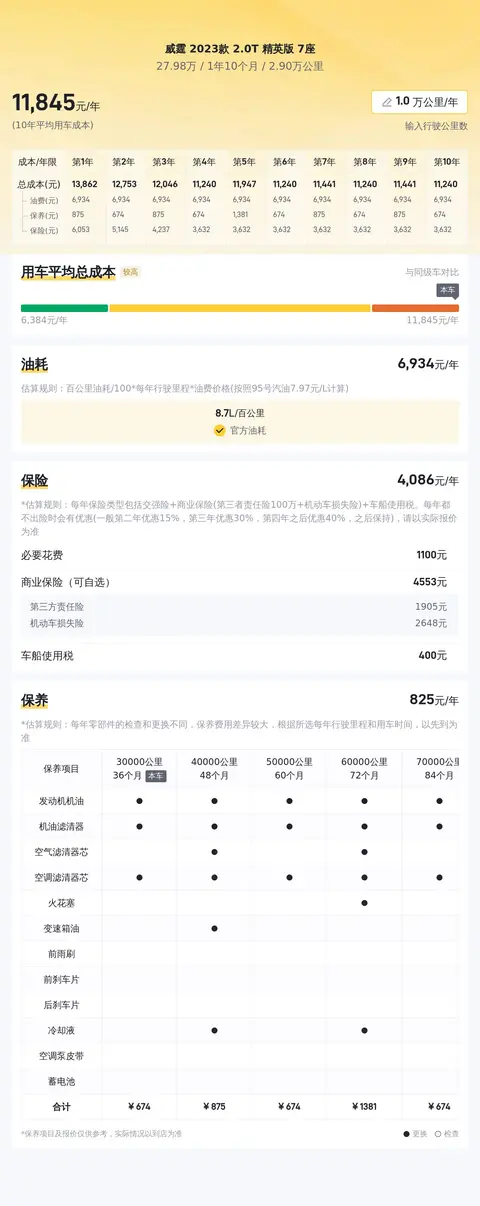 另外,根据估算,同级车的最低用车成本是13678元/年,最高是18989元/年,威霆 2023款 2.0T 精英版 7座是12608元/年,所以比较低。