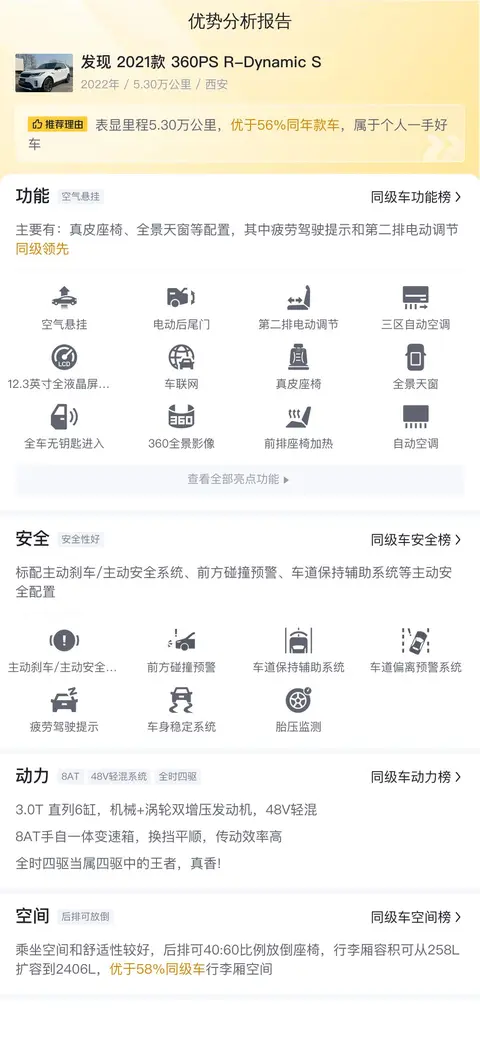 综上所述,路虎发现2021款360PS R-Dynamic S是一款集豪华、性能和舒适于一体的中大型SUV,作为二手车市场的一员,它凭借自身的优势和良好的市场口碑,吸引着众多消费者的关注。然而,消费者在购买二手车时也需要考虑到车辆的实际情况、维修记录、保养状况等因素,以及这款车的缺点,如油耗、维修保养成本等,做出理性选择。同时,卖家也应该提供准确、全面的车辆信息,确保买家能够全面了解车辆的情况。最终的购买决策应该是基于对车辆的深入了解和个人需求的综合考量。希望这篇文章能够为消费者提供有用的信息和参考,帮助大家做出更适合自己的选择。