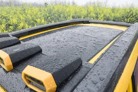 车尾部分亮点也不少,单摇臂式备胎罩设计挺新颖的,动感的造型加上下旋式快拆结构,在野外换备胎的时候特别方便,这也成了车子外观的一个大亮点。还有可行驶开启的车顶远光灯,晚上能把照明范围扩大,它动态承重有 50kg,放个外拓车顶帐篷完全没问题,对喜欢户外露营的朋友来说,简直太贴心了。从整体到细节,都能看出科技和实用结合得特别好。