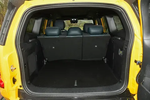 这车空间也宽敞,长 5125mm,宽 2025mm,高 1950mm(含备胎和车顶远光灯 + 露营灯),轴距 2880mm。后排座椅放倒后,后备箱装载空间能达到 1747L,全家出去旅游的行李,或者户外探险的装备,都能轻松装下。