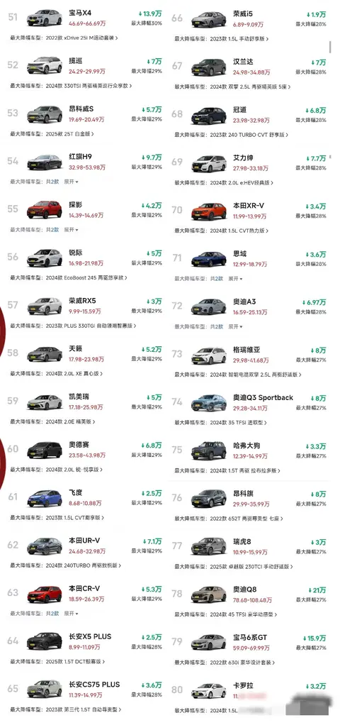 丰田凯美瑞(图片|配置|询价)降了5万,排到第59名。本田思域降价28%,排71名。格瑞维亚、昂科旗这些车型也在降价榜单里。大部分合资车优惠都在三成左右,像卡罗拉锐放、帕萨特这些老款车,价格比之前低了不少。
