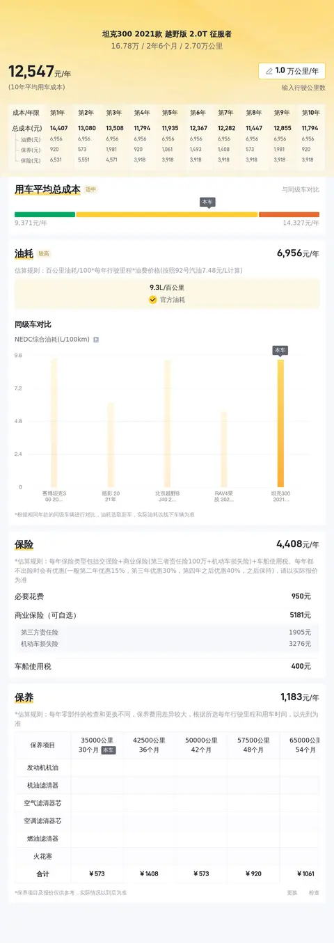 据估算,同级车的最低用车成本是12706元/年,最高是16656元/年,坦克300 2021款 越野版 2.0T 征服者是13368元/年,所以不算高。