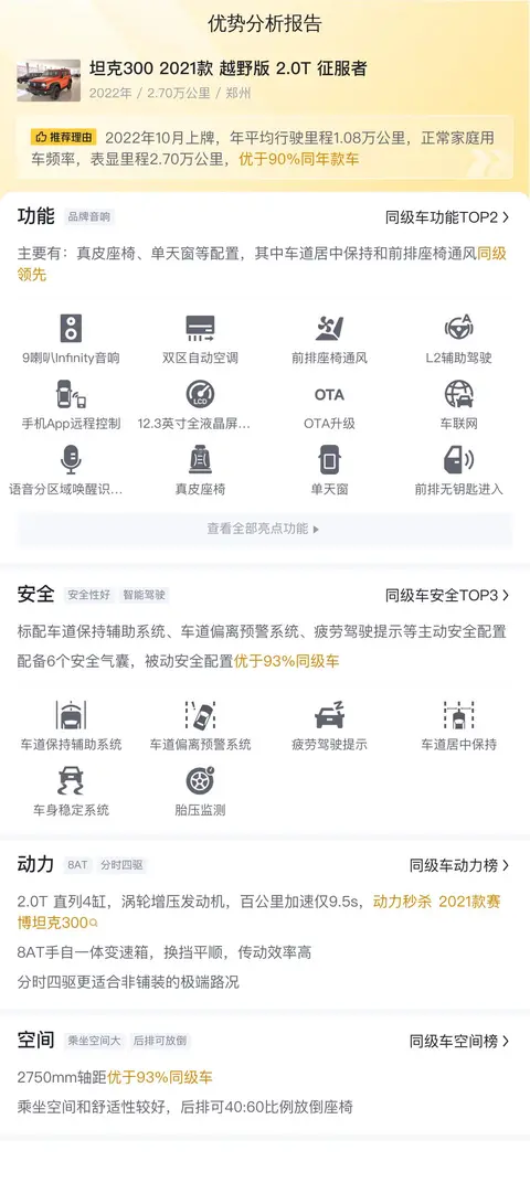 优势:坦克300从上市以来价格一直很坚挺,甚至很多车友买这辆车都需要加价提车,所以这辆坦克300 2021款 越野版 2.0T 征服者的性价比算是比较高了,毕竟开了不到3年便宜了6万多。而且这辆车的行驶里程较少,车况保持的很好,内饰几乎无磨损,整体成色很新。
