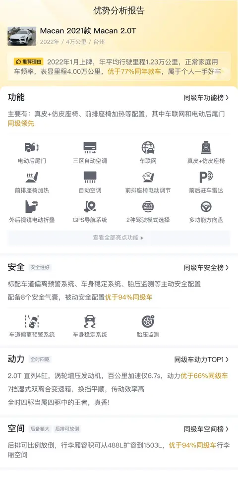 综上所述,这款二手保时捷Macan的 行驶里程4万公里,2022年1月首次上牌,在此期间过户0次,属于一手好车,还是具有一定吸引力的。而且售价35万,相较于新车来说,性价比还是不错的。不过,这款车并不太适合家用,维护保养费用比较高,乘坐体验不算太好,而且豪车后续的保障服务也不太完善,购买还需慎重考虑。