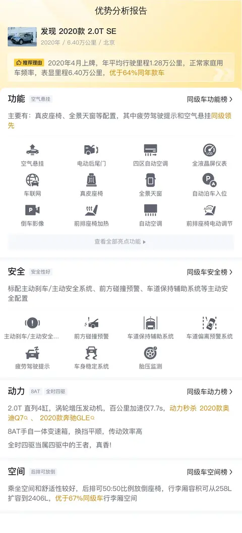 综上所述的新车含税价、用车成本、市场行情、优势分析、同款比价等数据仅供参考。在配置部分,因为二手车非标品,车辆可能会存在配置改装的情况,具体车况信息需要线下结合车辆实际情况进行综合参考。