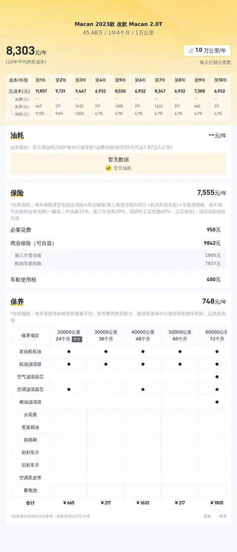 这款Macan 2023款改款Macan 2.0T,10年平均用车成本是16449元/年,4年多的车,保養費用會相對少一些。