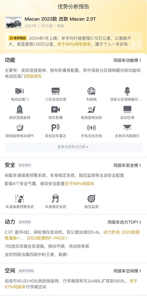 优势是这款Macan 2023款改款Macan 2.0T的车况非常新,基本是准新车,行驶里程也较少,整体性能都处于一个比较好的状态。加上其豪华品牌的加持,整体看起来逼格比较高。