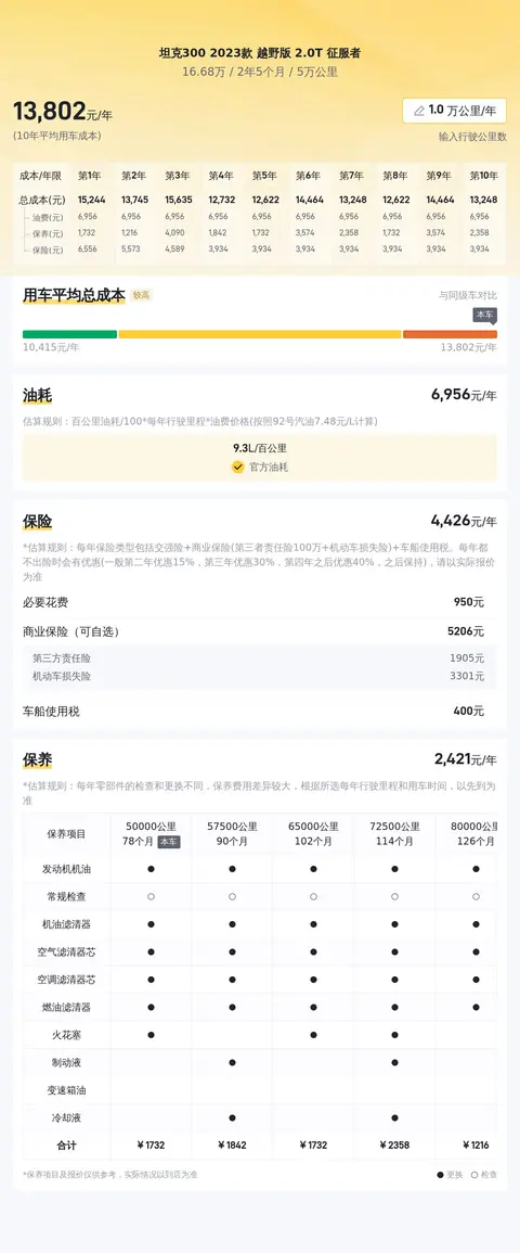 坦克300 2023款 越野版 2.0T 征服者的10年平均用车成本是13673元/年,而同级车的最低用车成本是11249元/年,最高是14901元/年,所以坦克300 2023款 越野版 2.0T 征服者的用车成本适中。