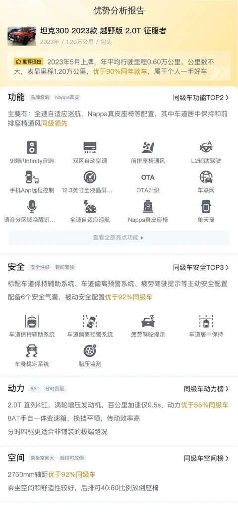 本次我们要介绍的车型是坦克300 2023款 越野版 2.0T 征服者,它的车源地和上牌地都是在包头,上牌日期2023年5月,表显里程1.2万公里,新车指导价21.58万,二手车报价17.8万,过户次数0次,车身颜色为橙色,排放标准国VI b。