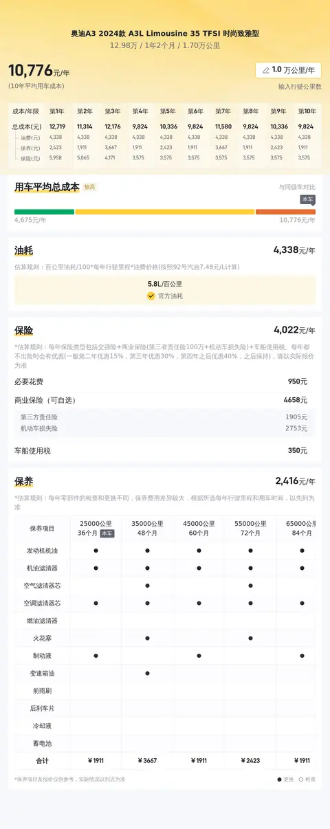 根据大数据分析,当前这款奥迪A3的二手市场估价在13.02万至15.55万元之间,实际售价会根据车辆状况等因素有所不同。年度用车成本方面,按照每年行驶2万公里计算,预计平均成本约为11177元,具体支出视使用情况而定。