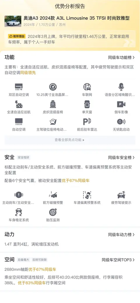 接下来,让我们深入了解这辆2024款奥迪A3L Limousine 35 TFSI 时尚致雅型。它已行驶1.7万公里,搭载1.4T涡轮增压发动机,综合油耗约为6.3L/100km,新车指导价为23.07万元,而当前二手市场报价为12.98万元,为您提供了一个更经济的购车选择。