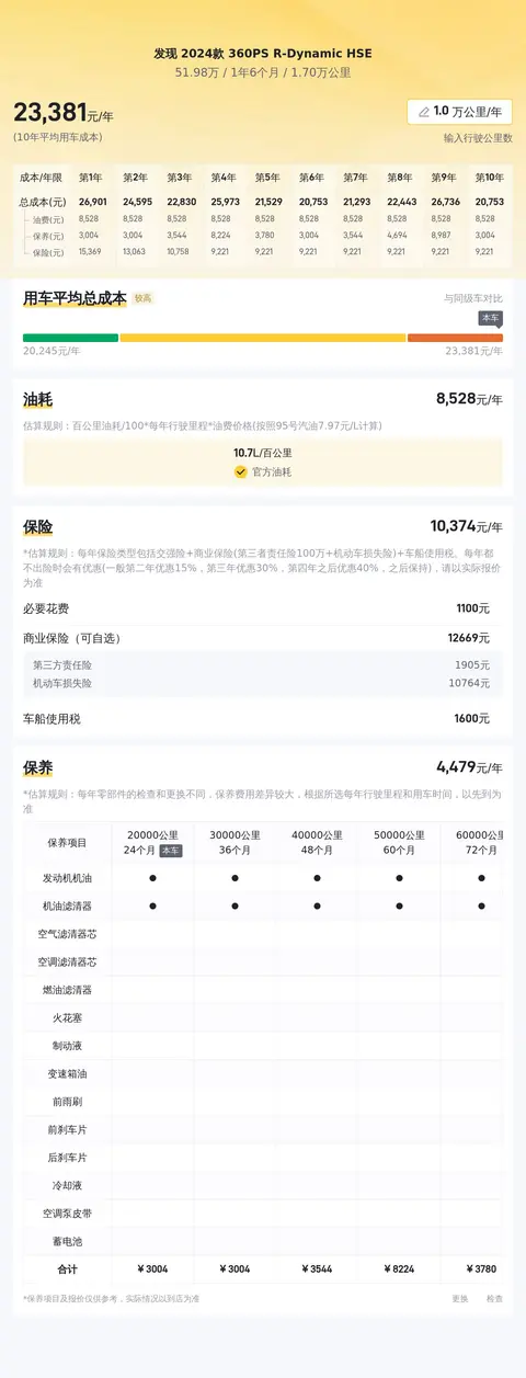 接下来,我们来看看这款车的用车成本。根据相关数据估算,发现2024款360PS R-Dynamic HSE的年均综合用车成本大约为2.3万元左右。当然,这个数字还会随着车主的具体使用情况而有所变动。